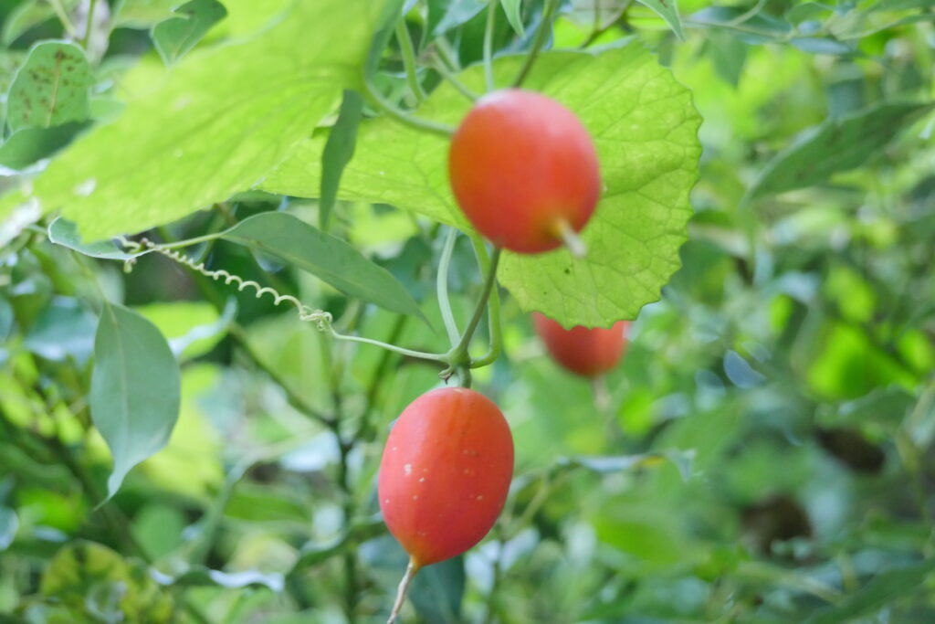 これもいろんな色で魅力的な実をつけ、食べてみたくなるがたべられない。大きな葉と巻きひげがつき、葉は3-5裂となる。花は小さく目立たず両性花。