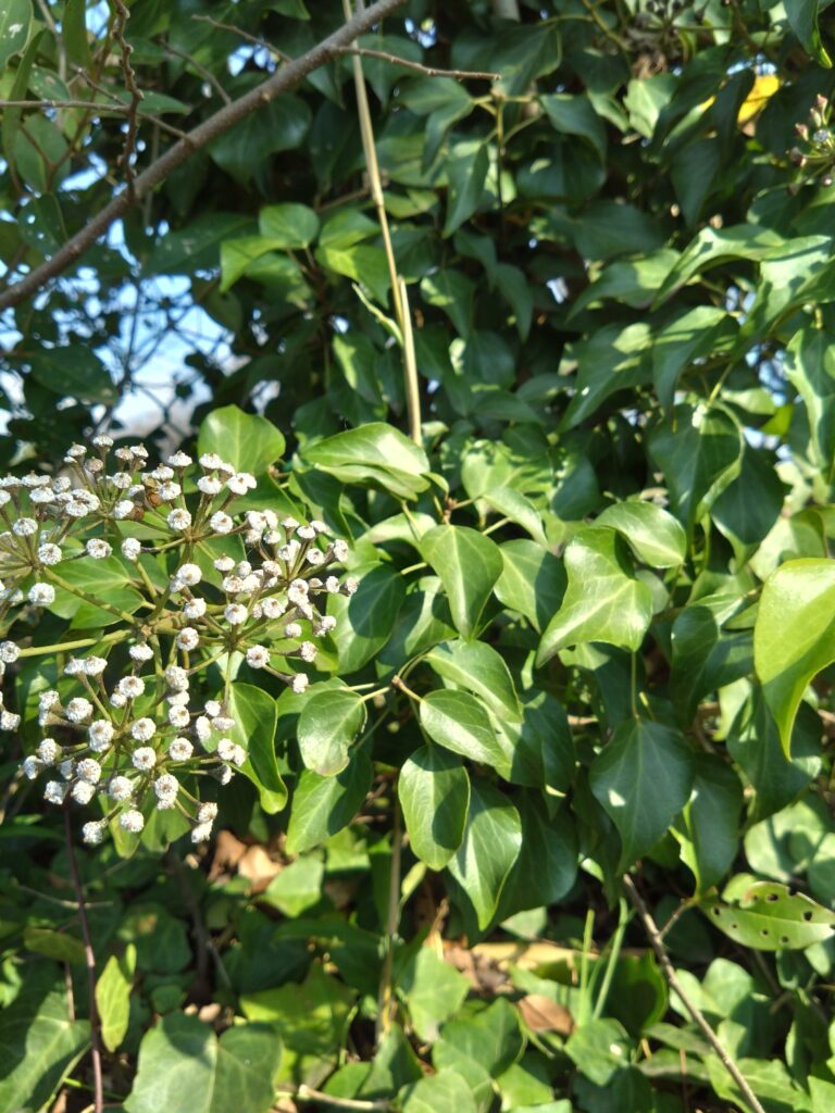 茎から気根を出して這い登る。ウコギ科キヅタ属。果実は円く、翌年に黒く熟す。常緑樹。