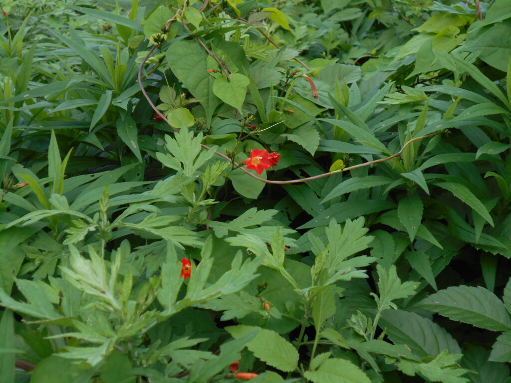 ヒルガオ科ルコウソウ属、帰化植物。道端で小さな赤い花を見かける。