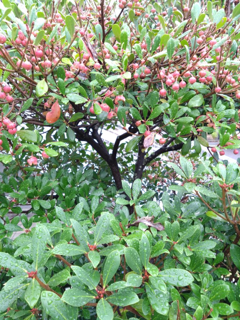 時に葉の一枚が赤くなるので、赤いロビン(駒鳥)が止まっているように見える?新葉が赤く、春に紅葉しているように見えてきれいです。在来のカナメモチとオオカナメモチの交配品種で、葉が大きく、より虫がつきにくく、丈夫なので、植え込みに利用されているようです。