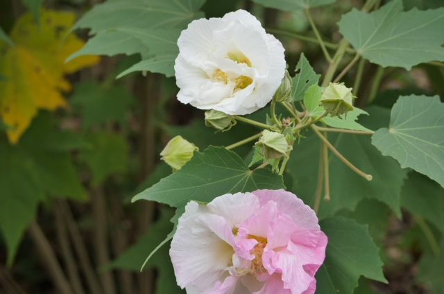 夏から枝の先に紅か白色の大きな花をつけ、葉も大きく目線に目立つ。フヨウの八重咲で白色から赤色に変わるのがスイフヨウ(酔芙蓉)、写真。