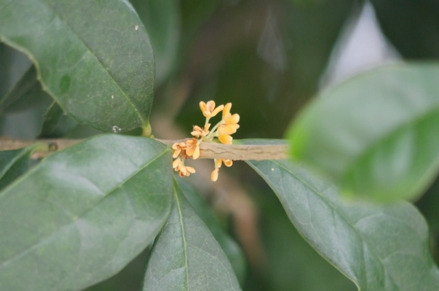 秋にオレンジ色の小さな花をいっぱいにつけて良い香りを漂わせる。庭木の人気者。中国原産で雄木だけが入り、挿し木で増えてきたので、雌木がなく、実・種ができない。春のジンチョウゲ、夏のクチナシ、秋のキンモクセイを三大高木という。冬のロウバイを加え四大にすることもあるようです。花色が白いのはギンモクセイ。香りはキンの勝ちとか。葉に鋸歯がみえないのもキンの特徴。