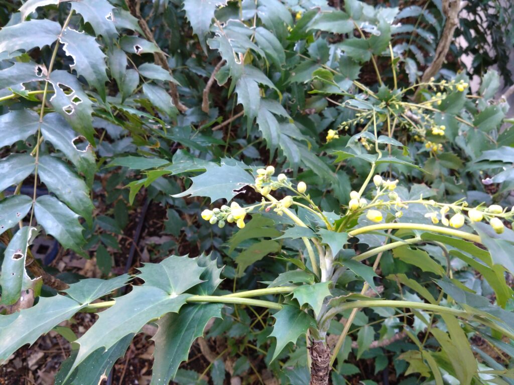 春先に総状に黄色の花弁と萼片をつける、秋の実はブルーで可愛い。葉がヒイラギのようにトゲで触ると痛い。